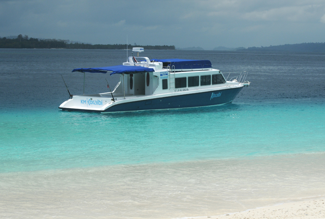 O acesso às ondas é feito por barco, com logística organizada pelo resort para maximizar o tempo no mar.