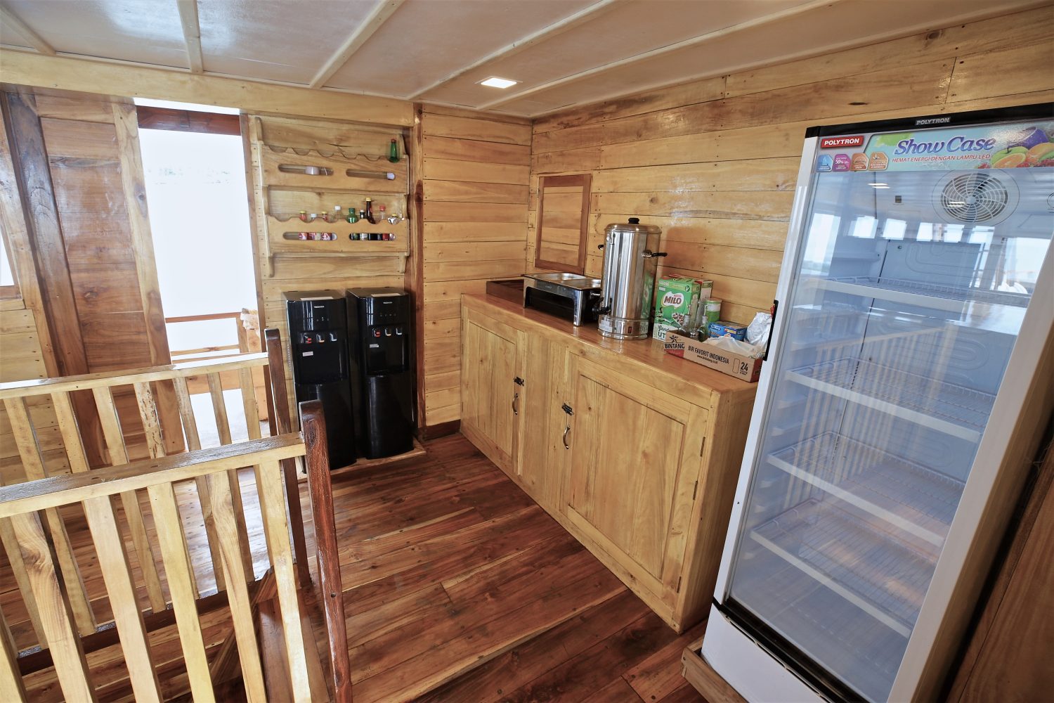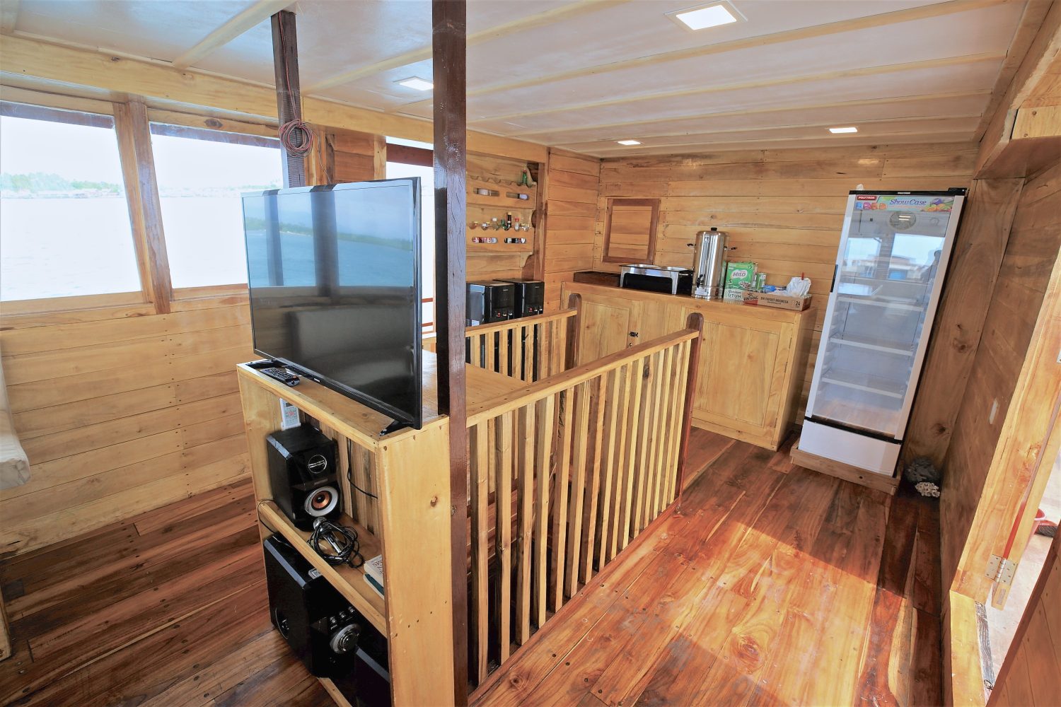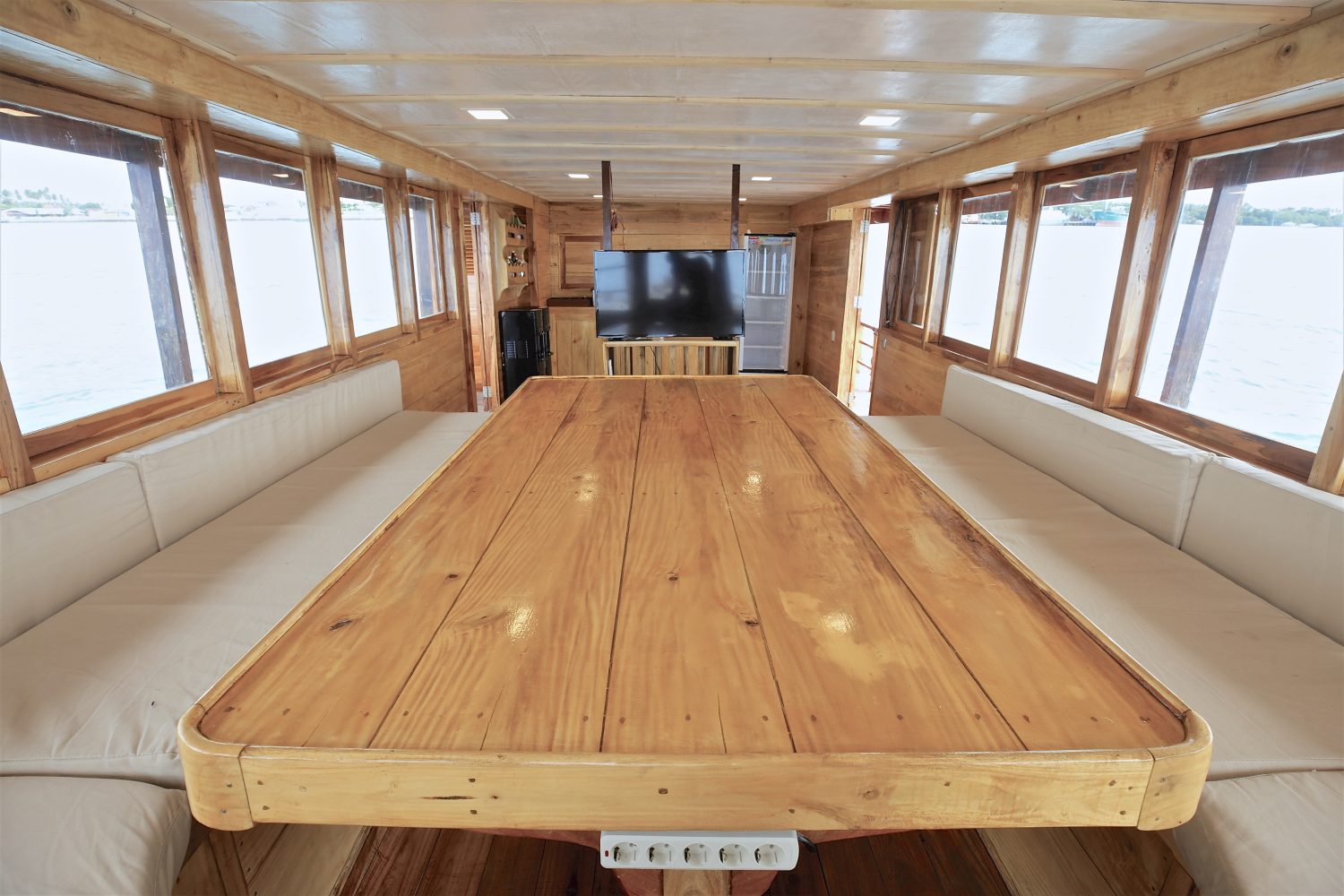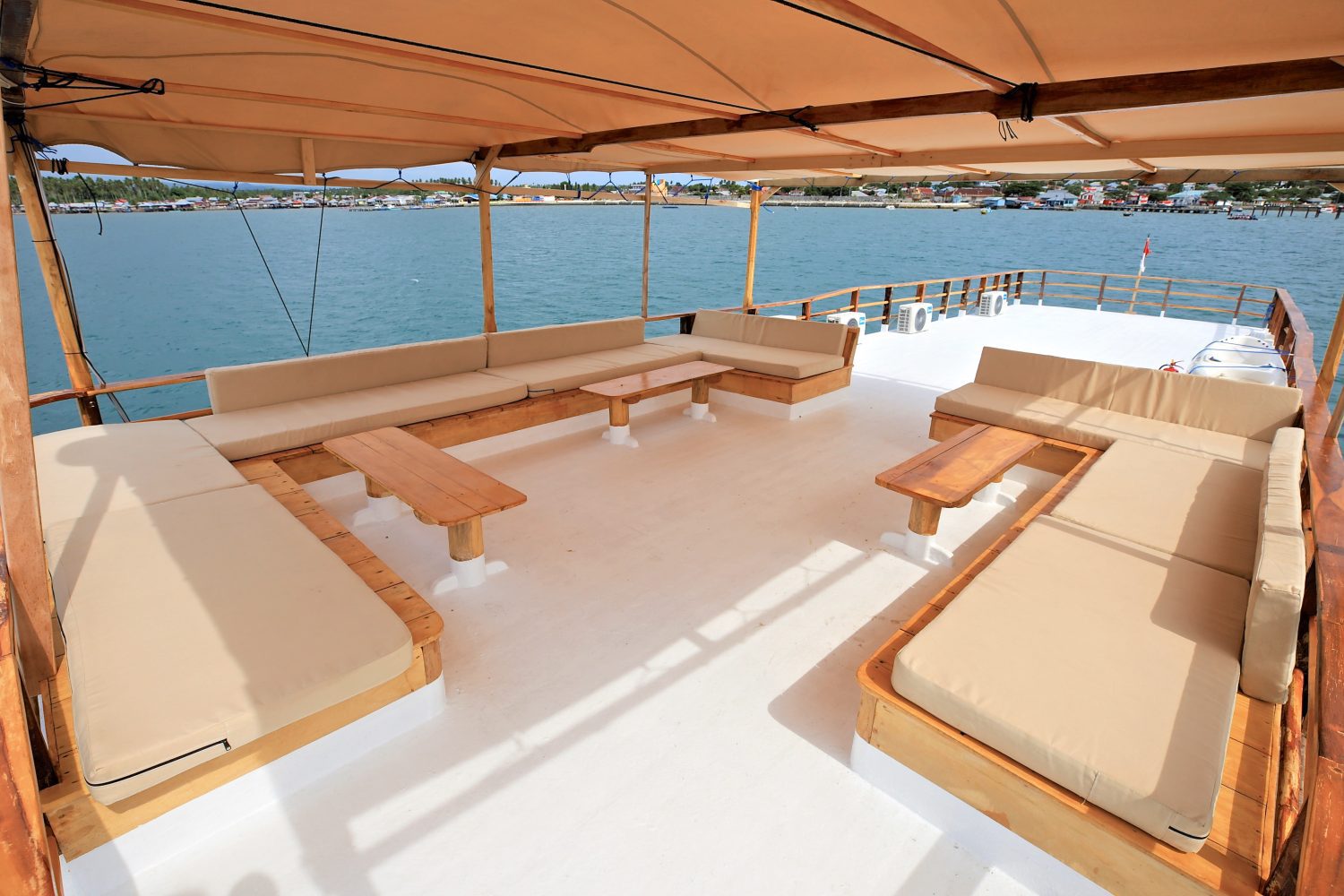 O barco possui quatro níveis e três decks principais, oferecendo bastante espaço para relaxar entre as sessões de surf. No deck superior, um lounge com sombra, almofadas e bean bags é o local perfeito para curtir o visual das ilhas ou acompanhar seus amigos pegando tubos.